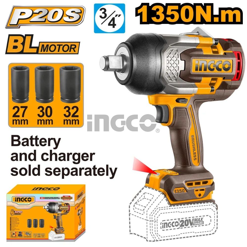 INGCO Гайковерт аккумуляторный бесщеточный ударный Li-Ion 20W SUPER INDUSTRIAL SOLO/1350 Нм