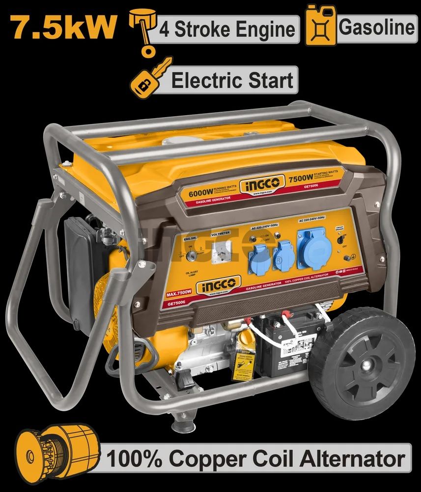 Бензиновый генератор 220 В 6,0/7,5 кВт INGCO GE75006 INDUSTRIAL рассчитан на использование в качестве аварийного или автономного источника электроэнергии для питания маломощных бытовых электроприборов и электроинструмента.