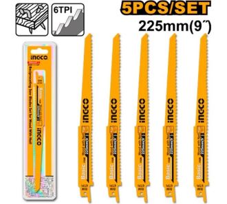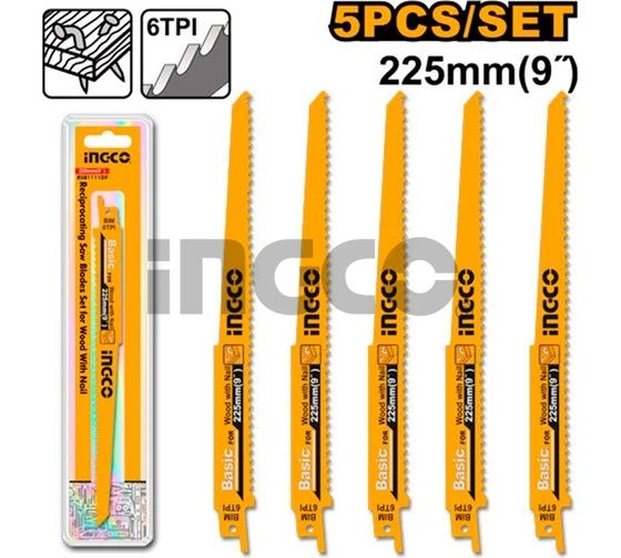 Набор пильных полотен из 5шт. для сабельной пилы по дереву 6TPI-BIM 225х19х1.25мм INGCO RSB1111DF