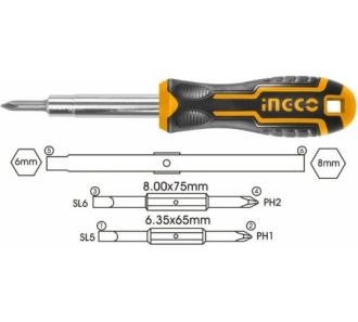 Комбинированная отверткa INGCO 6 в 1 AKISD0608 представляет собой инструмент со сменными стержнями для работы с крепежом. Комплект состоит из двухкомпонентной рукоятки, держателя для стержней на 6 и 8 мм, а также двух рабочих стержней с двойными наконечниками с разными профилями. Инструмент выполнен из высококачественной хромованадиевой стали, что обеспечивает прочность и долговечность. Эргономичная форма рукояти подходит для длительной работы без усталости.