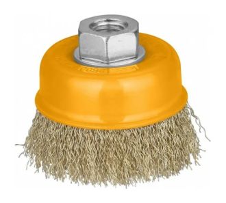 Щетка чашечная INGCO WB10751 используется для работы с УШМ. Служит для зачистки поверхностей покрытых лаком, краской, подходит для устранения ржавчины на металлических изделиях.